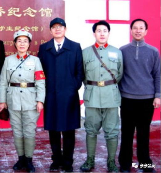 抗联老战士李敏带领的抗联宣传小分队在旅俄华侨纪念馆留念2002年我开始研究展示旅俄华侨历史后,接触到了许多历史人物和历史资料,其中就有一些关于《红灯记》故事原型地的相关文字资料和报道,这些报道探究的地点主要集中在河北、吉林、和黑龙江鸡西的密山、黑河的五大连池龙镇。面对这些资料,我进行了认真反复的比对和印证,又对相关资料进行了进一步的查询,明确了一个关键问题,那就是《红灯记》故事不是像《沙家浜》、《智取威虎山》那样有明确的故事发生地,而《红灯记》原故事基础中电影《革命自有后来人》给出的主要故事背景是“北满”地区,就是说故事以“北满”地区为北景。另外故事主人公李玉和和鸠山在哈尔滨“老毛子铁路医院”有过接触,日伪时期划分哈尔滨以北为“北满”。三是剧中的“龙潭车站”是哈尔滨向北的铁路中的一个小站。因此,电影《革命自有后来人》是在“北满”这样一个背景下,综合其它故事而创造出的一个全新的故事梗概。因此,我认为将《红灯记》故事原型地确定在龙镇是贴切的,与原剧剧本中提供的信息是相符合的。于是2006年我向黑河市人大提交了“关于在龙镇辟建《红灯记》旅游区的建议”,同时我将与《红灯记》有关的资料寄给时任五大连池市市长的徐飞。五大连池市委市政府很重视这一建议,很慎重的派出了一个考察组,就编剧沈默君原创《革命自有后来人》电影的诞生、演变为评剧、京剧以及演员到龙镇体验生活、听讲抗联英雄事迹等情况进行了采访取证,又经过许多同志们的不懈努力,终于在五大连池市的龙镇镇建立了《红灯记》广场等纪念设施,在龙镇高速公路边上竖起了《红灯记》故事原型地的巨幅宣传广告,在五大连池市“东北抗联纪念馆五大连池分馆”中和朝阳山爱国主义教育基地展览中也分别对这个故事加以展示。