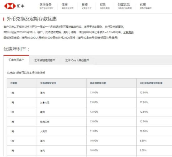 汇丰银行还为新客户兑换指定货币的定期存款提供优惠年利率。例如,新账户开立1周内人民币流通理财年利率高达11%。