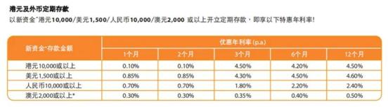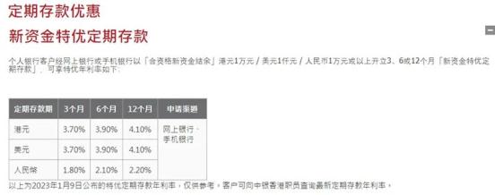 银行官网截图中银香港为新开户的客户设立开立3、6或12个月的新资金特优定期存款利率。其中,港元、美元1年期定期优惠年利率为4.1%。