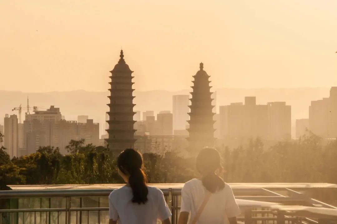 时间推移,天空之色又出现无穷变幻,极目远眺,玫瑰色的朝霞从远方渐渐铺展至眼前,又逐渐延伸向无边无际的远方,犹如天地又变换了新的披肩,映衬着永祚双塔的独特沧桑。岁月更替,双塔在光与影的交错里,演绎一场与时光的相逢,孑然舞于尘风之间,清音念念,回眸人们在这里的每一场相遇。