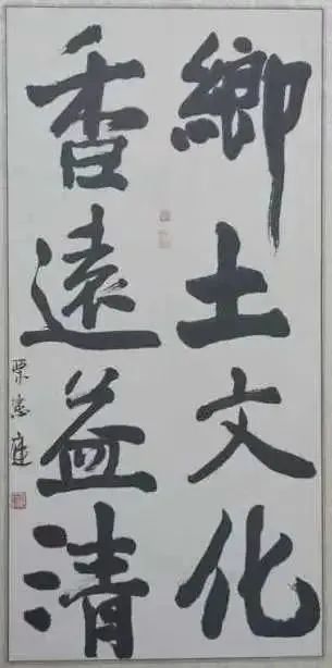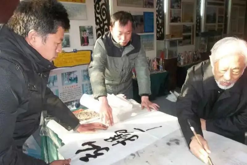 这个设想一经提出,就得到了管理区领导层的一致通过。2011年初冬,郭振军想请栗宪庭給题写馆名,可他不认识栗宪庭。巧的是他正好和我弟弟是高中同学,我家大哥原来也曾担任过管理区领导,我二哥又是一直在北京跟着宪庭。于是,我家弟兄三个一起上阵,我和大哥带着学区学校的领导专程进京,到了宋庄再由二哥领着一众人马去拜访栗宪庭。栗宪庭的生活习惯一般是上午十一点才起床。我们到的时候,他不仅早早地就起床了,还亲自到大门外迎候。来到客厅,大家就坐后,栗宪庭拿出来他家最好的茶叶,亲自为大家表演功夫茶。更让人感动的是,和家乡人在一起的几个小时里,栗宪庭从始至终一直是以一口地地道道的和村方言来说话的,而且语调低低的柔柔的,给人一种和蔼可亲谦恭随意的感觉。栗宪庭不仅写了馆名,題词“乡土文化,香远益清”,还为每一位来的家乡人都题词一幅。