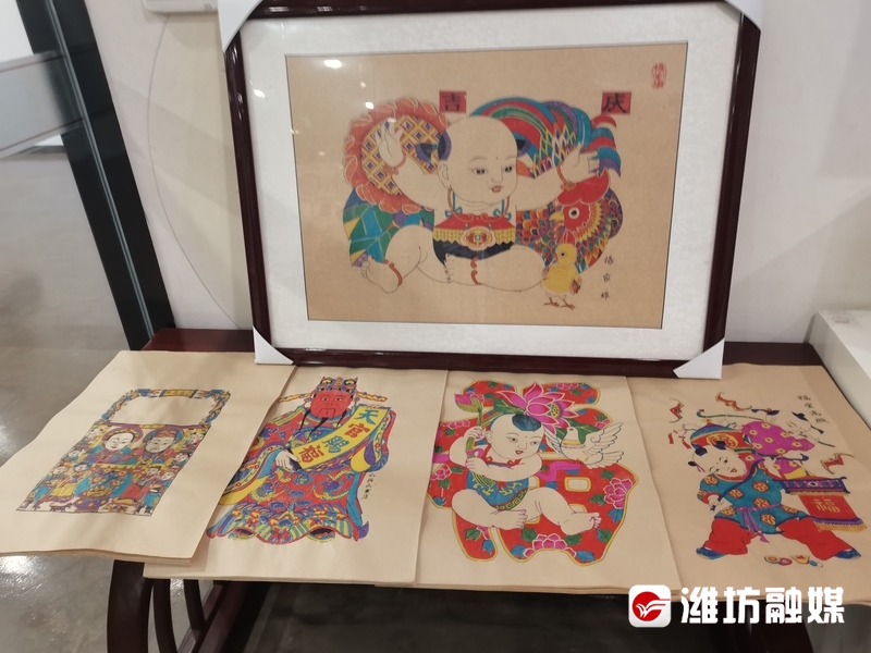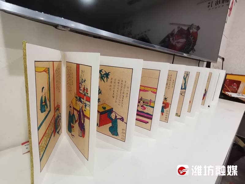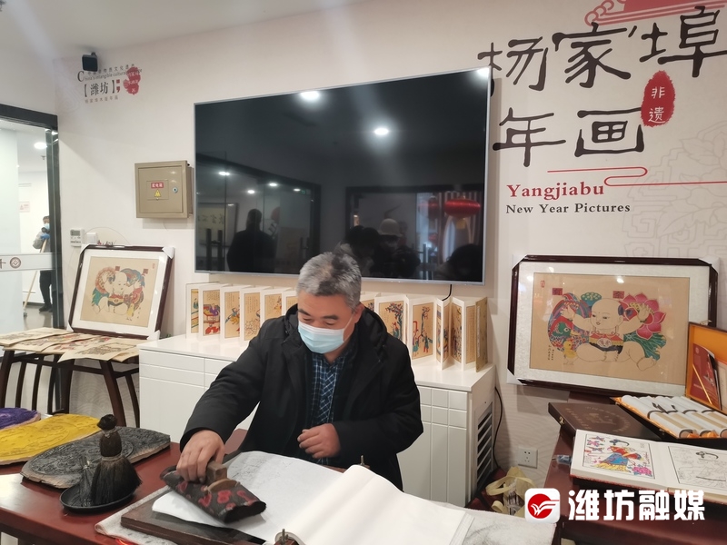在杨乃东的工作室里,琳琅满目的年画作品让人目不暇接。杨家埠木版年画集以及二十四孝、红楼梦、三国演义等主题的木版年画,吸引市民前来选购。记者看到,杨乃东正拿着蘸满颜料的刷子专注地印制年画。不一会儿,白纸上就出现了内容丰富的年画图案。