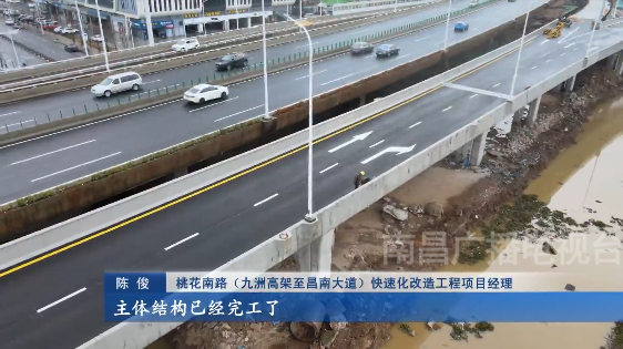 桃花南路(九洲高架至昌南大道)快速化改造工程项目经理陈俊:“我们桃花南路快速化改造工程,目前主桥桥梁结构以及我们匝道三条互通的定向匝道、主体结构已经完工了。我们现在正在做一些声屏障,包括防眩板这些附属结构施工。”