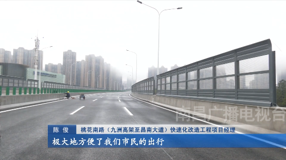 桃花南路(九洲高架至昌南大道)快速化改造工程项目经理陈俊:“我们这个项目是作为城市‘十纵十横’的一个重要组成部分,通车之后可以很好地衔接起城市南一环路到二环线的一个衔接,直接往南向桃新大道延伸,极大地方便了我们市民的出行。”