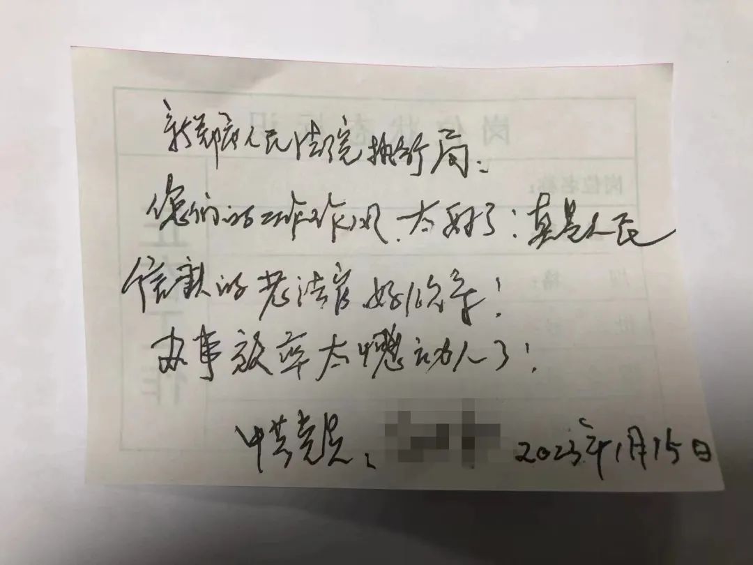 “在此我和我的全家都非常感谢马超法官......”、“你们的工作效率太高了......”、“办案高效司法为民,热情服务公正执法......”,近日,新郑法院集中执行活动的持续深入开展,拿到执行款的老百姓纷纷发来感谢信,送来锦旗表达对法院和执行干警的感谢之情。