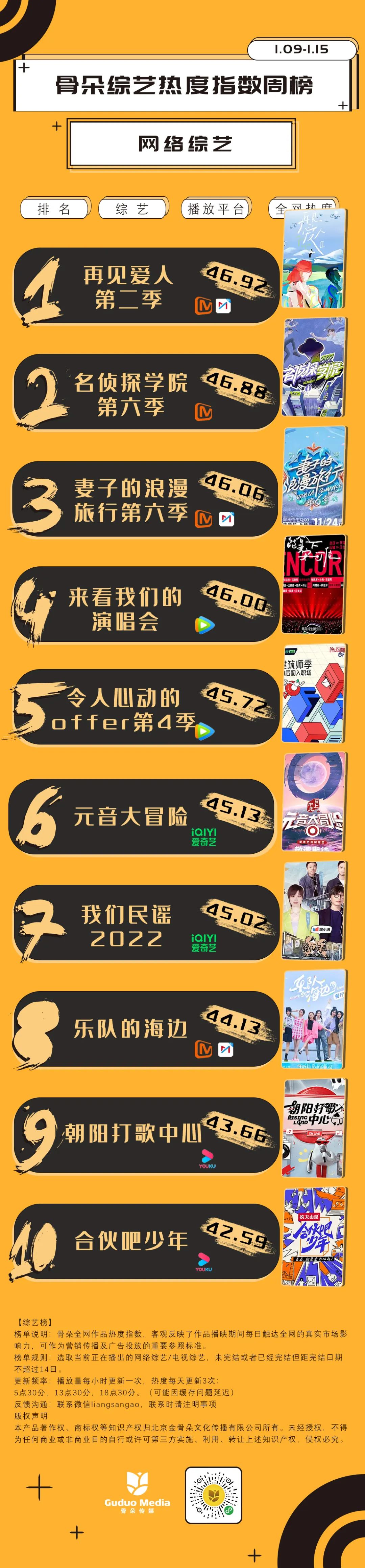 《再见爱人2》再登网综周榜榜首,上期榜首《名侦探学院6》退至第二,《妻子的浪漫旅行6》位列第三。《来看我们的演唱会》仍旧位列第四,《令人心动的offer4》取代《我们民谣2022》成为第五。