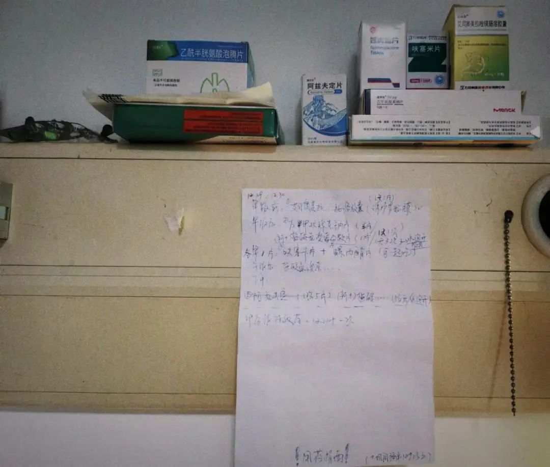 ●姥娘每天的吃药安排。吕亚思摄一切像是回到了半个月前,刚入院那天,姥娘躺在靠近角落的病床上,也是嘟囔着胡话。一会儿闹着要下床去卫生间解手,一会儿问门口奶箱里的牛奶取了没有?似乎陷入了某个曾经的生活场景。