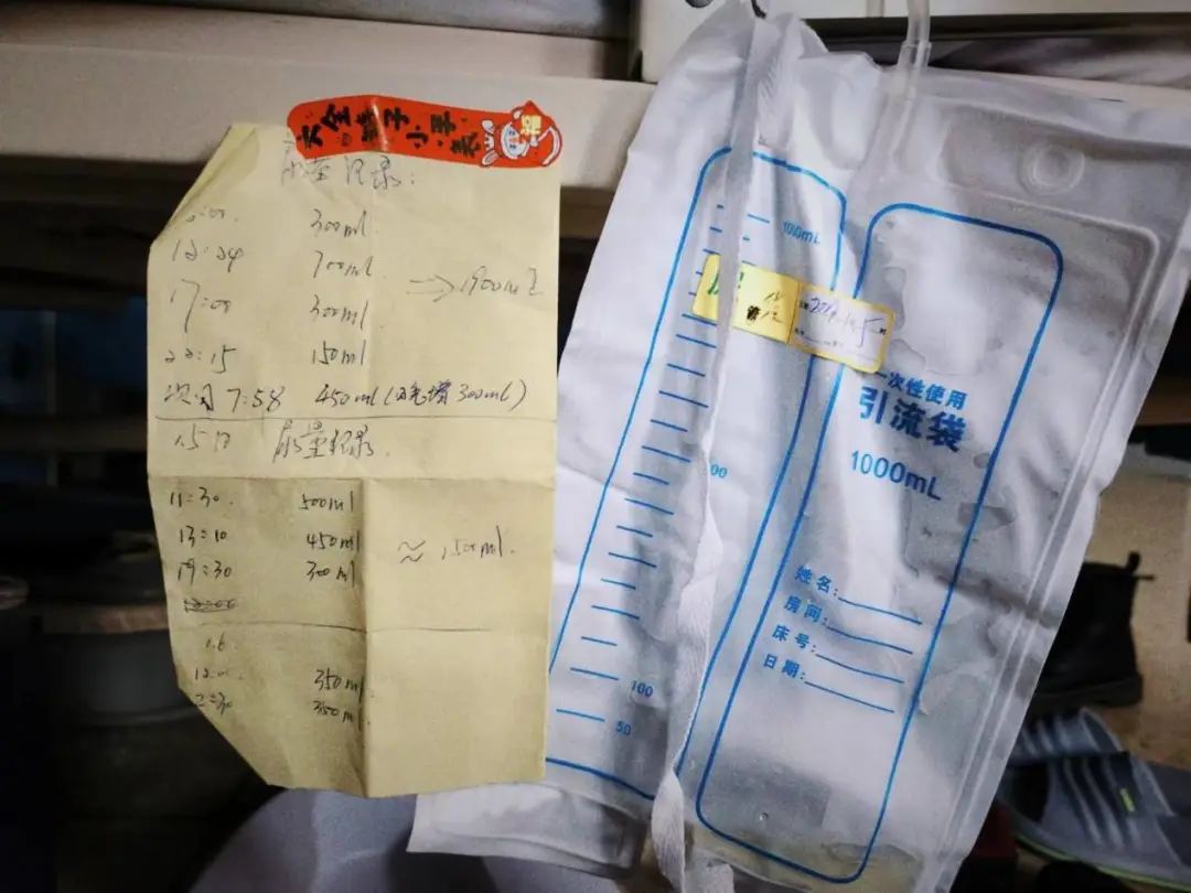 ●姥娘的尿袋和排量记录。吕亚思摄我也在为自己没能过早介入而自责。这段时间,我脑子里全是关于新冠的那些药名,做梦梦到的也是这些。人在焦虑的时候,就觉得总得做点什么。从北京回来时,我先花550块买了一瓶阿兹夫定。几天后,买了印度版特效药,2500块。后来我在网上看到,仿制药成分造假的消息越来越多,没敢给姥娘吃。