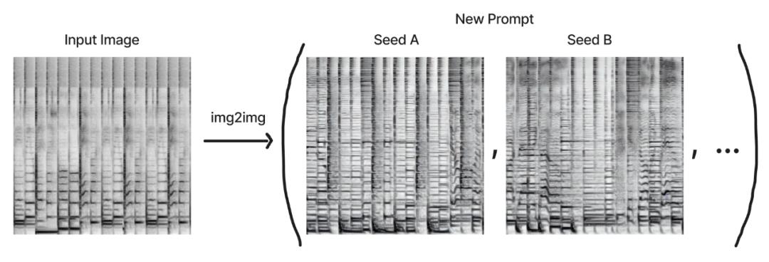 使用 diffusion 模型不仅可以将创作条件设置为文本 prompt,还可以设置为其他图像。这对于修正声音的同时保留你喜欢的原始片段的结构非常有用。用户可以使用去噪强度参数控制与原始片段的偏离程度,并向新的 prompt 方向倾斜。