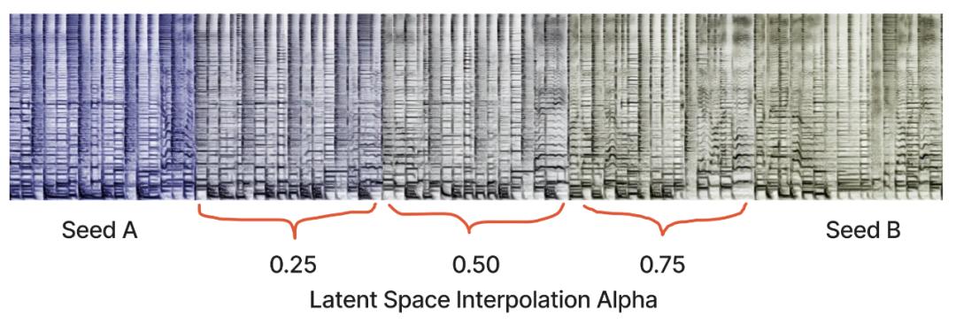 然而,即使使用这种方法,片段之间的过渡仍然很突兀。对于具有相同整体结构的同一 prompt 的多种解释,仍然可以在它们的氛围和旋律主题上呈现很大不同。为了解决这个问题,我们在模型潜在空间中的 prompt 和 seed 之间平滑地进行插值。在 diffusion 模型中,潜在空间是一个特征向量,它嵌入了模型可以生成的整个可能空间。彼此相似的项目在潜在空间中是接近的,并且潜在空间的每个数值都解码为可行的输出。