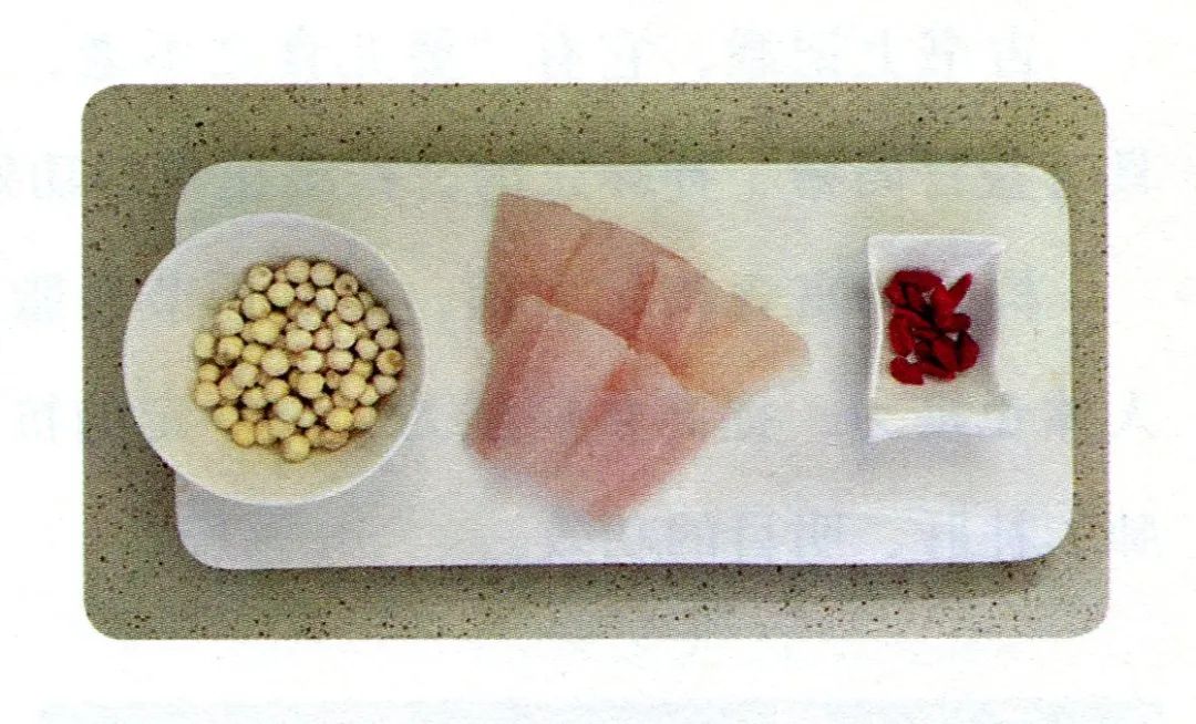 [主料]龙利鱼150g,新鲜芡实50g,干枸杞子3g。