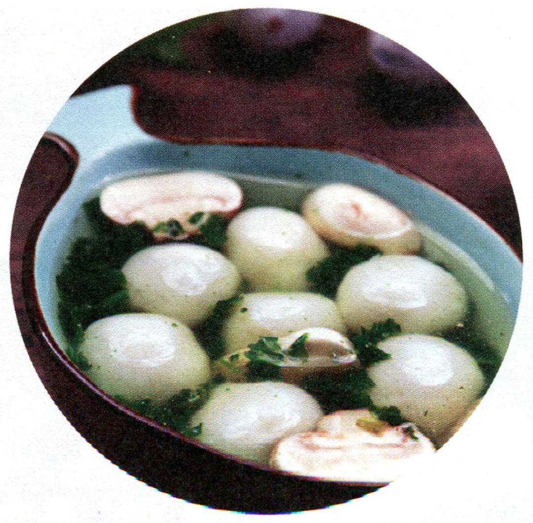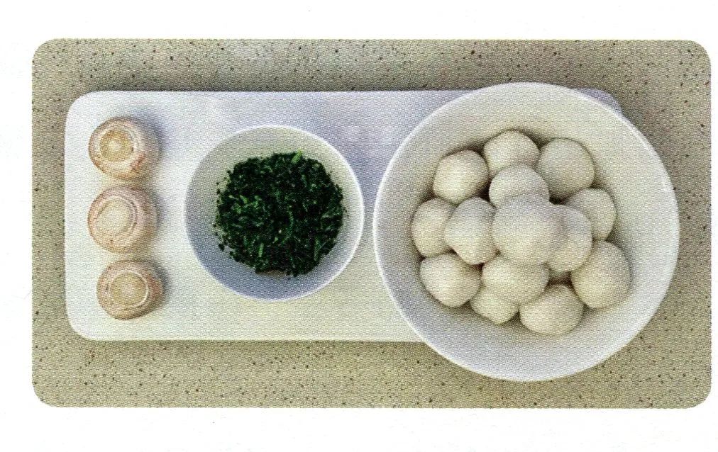 [主料]鱼丸约200g(草鱼肉200g、1/2个蛋清12g、葱姜水适量),荠菜30g,蘑菇50g。