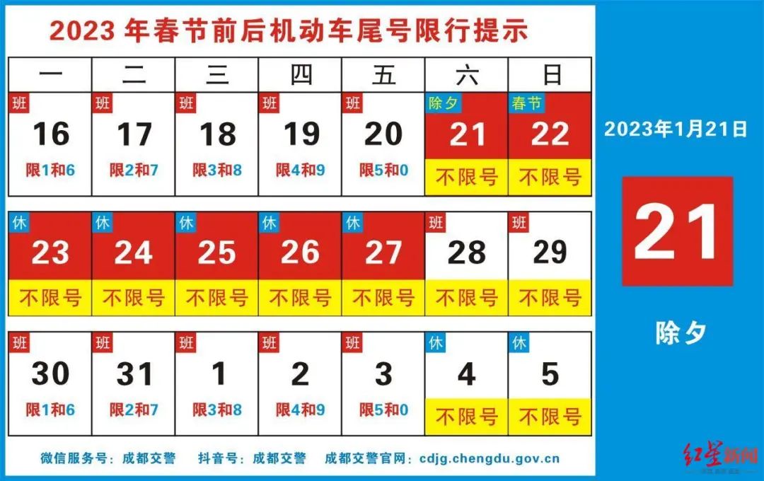 2023年春节假期从1月21日开始至1月27日结束,历时7天。春节期间,车流量增多,进出城通道的交通压力增大。为方便广大市民出行,1月18日,成都交警发布2023年春节两公布一提示。