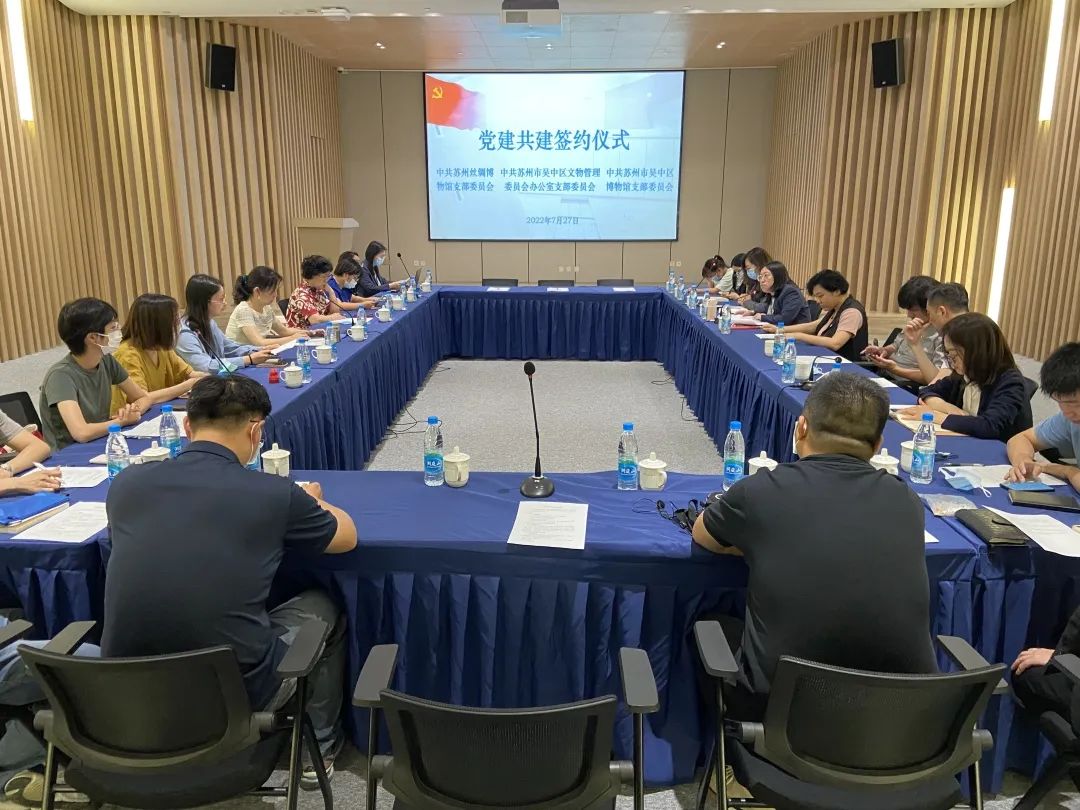 2022年,博物馆党支部坚持以习近平新时代中国特色社会主义思想为指导,深入学习贯彻党的二十大精神,认真贯彻落实党的路线方针政策和上级决策部署,扎实开展基层党建专项提升行动,立足博物馆事业可持续发展定位,努力使党支部工作更好地融入博物馆发展、融入党员需求、融入群众关切。深化拓展跨行业党建融合共建,与苏州丝绸博物馆、苏州市职业大学、吴中公安分局巡特警大队、吴中人民医院、园区公文中心等单位党组织结对共建,开展“丝韵江南 吴地守望”文博党员薪火相传、公共场馆反恐防暴演练等特色党日活动,通过多形式的集中学习、交流分享、实地研学、志愿服务,在馆内形成学习宣传贯彻党的二十大精神热潮,全年接待“喜迎二十大·奋进新征程”主题实践活动参观逾万人次。