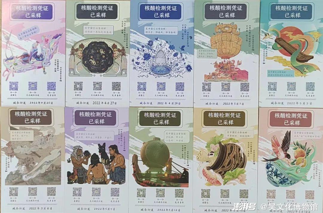 年内扎实做好常态化疫情防控工作,建立健全防控应对机制。落实好“限量、预约、错峰”等开放管理要求,充实配备防护用品,规范做好场馆通风、公用设施设备清洁消毒等常态化管理。馆内职工和开放服务人员积极落实疫苗接种、定期核酸检测,传达学习贯彻最新防疫政策、科学防疫知识和防护措施。2022年2月至9月期间,全馆党员干部职工积极响应号召,坚持“在线营业”和“下沉一线”,迅速成立志愿服务队,在街道社区、高速路口、火车站、黄码点等开展志愿服务,用“大白”身影书写为民服务初心,累计志愿服务1300余人次。期间,携手城南街道创新推出“看国宝”“国宝之谜”系列联名款核酸检测凭证,让辖区市民在核酸采样时“遇见”吴地文化、开启“考古寻宝”之旅。