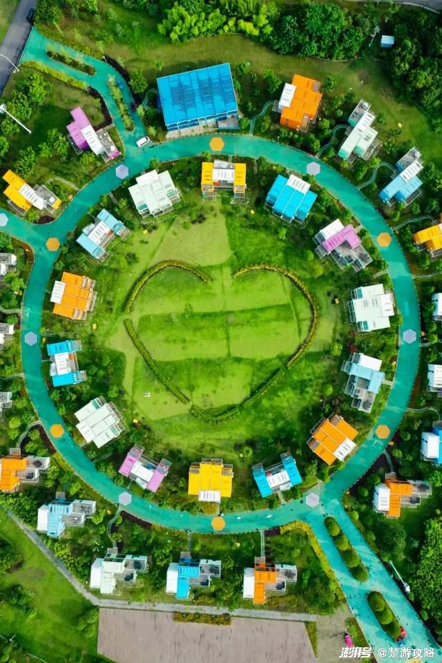 在园区的中心,33栋集装箱别墅围成了两个环形,打造成爱情主题的集装箱酒店,中心的草坪被剪出了爱心的形状,这点小心机,简直不要太浪漫!