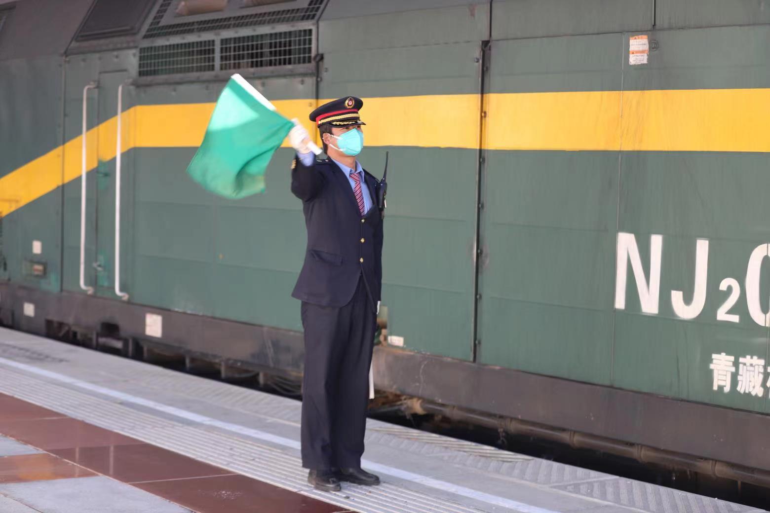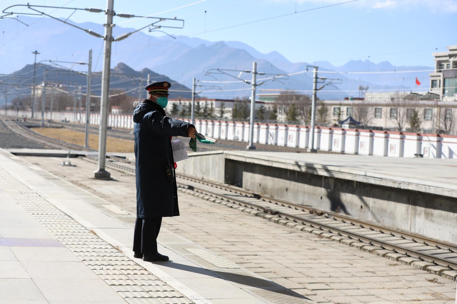 伴随着一圈一圈挥动的信号旗,列车缓缓驶出拉萨站,全海文收拢起信号旗,快步走向站台的另一端。