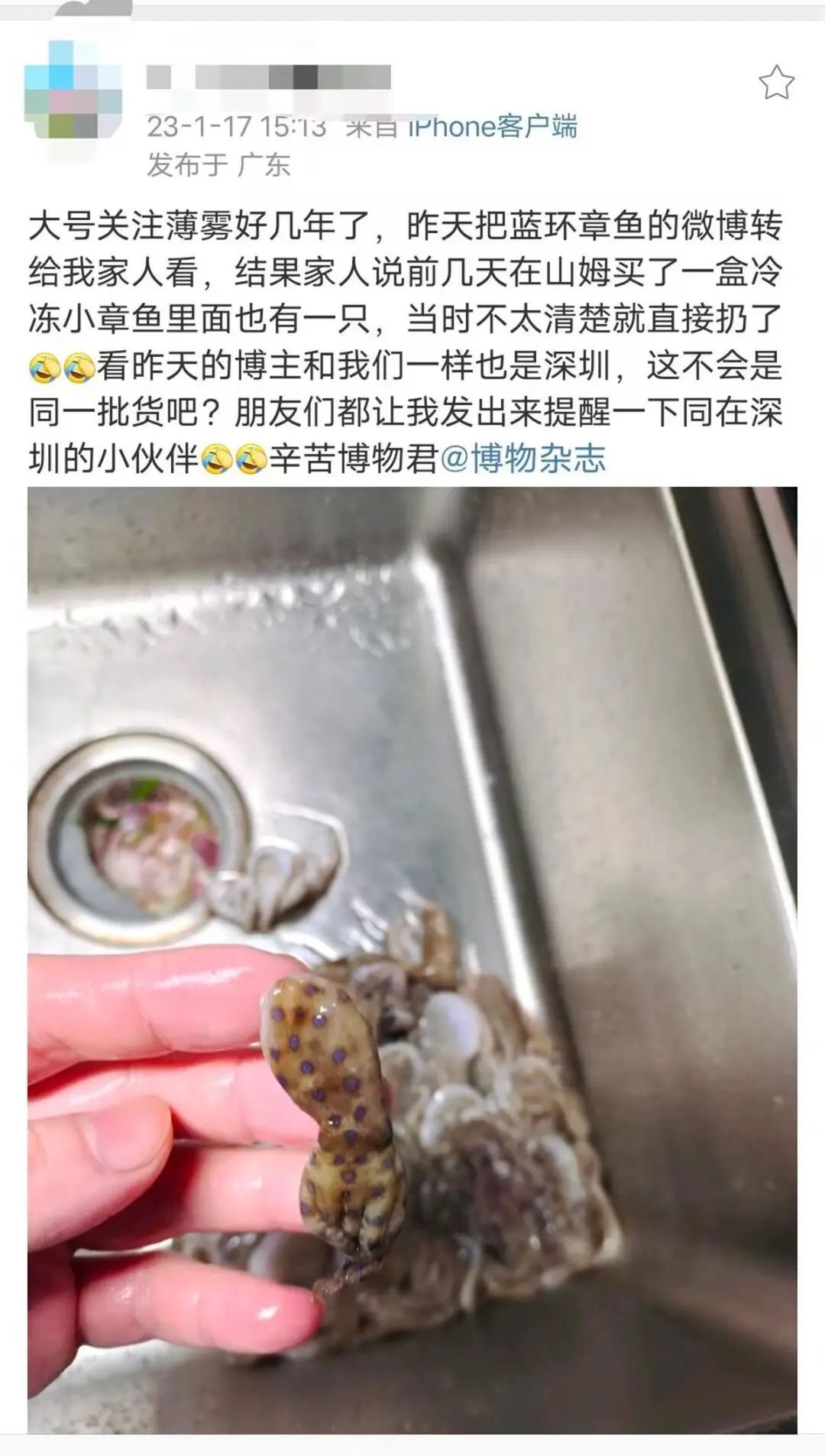 1月17日,一位深圳的网友发帖称,家人几日前曾在山姆福田店买了一盒冷冻小章鱼,打开发现里面有一只蓝环章鱼。