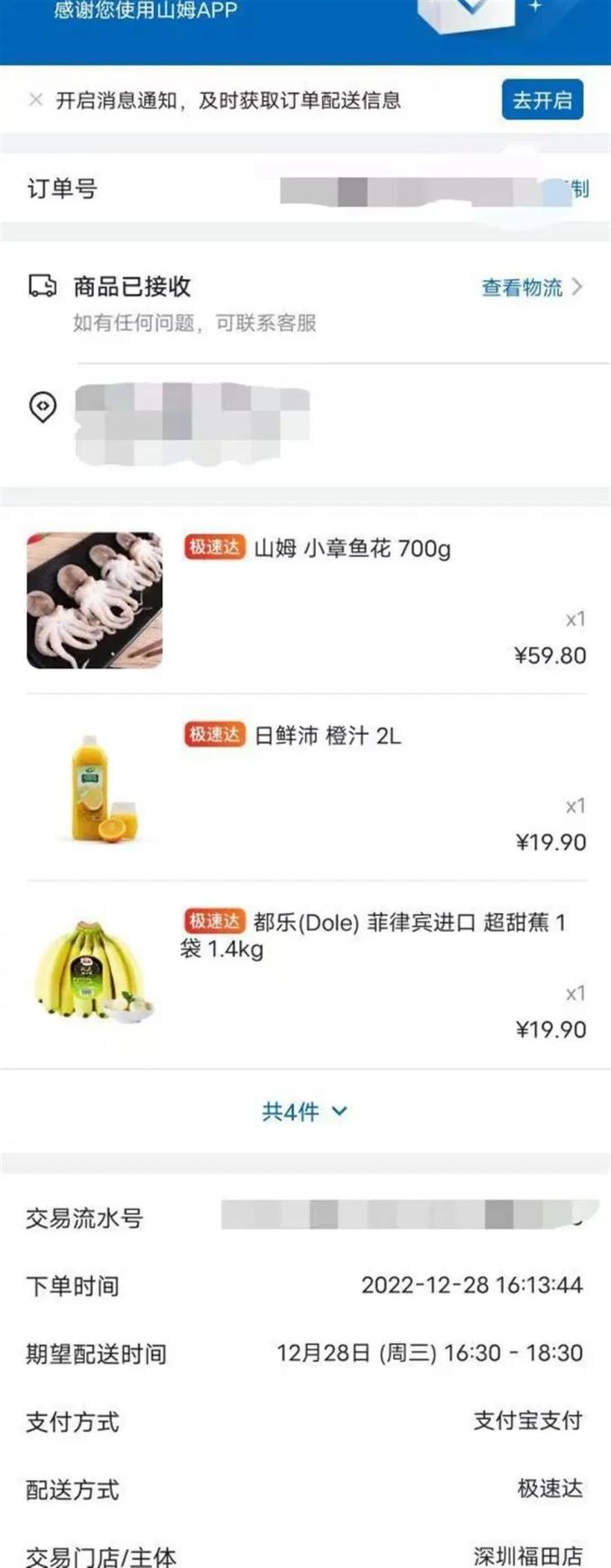 据王女士向记者提供的订单截图显示,2022年12月28日下午,王女士的家人通过山姆会员商店APP下单了4件商品,其中,包括一盒山姆小章鱼花,售价为59.8元。该截图还显示,这笔订单的交易门店为深圳福田店。