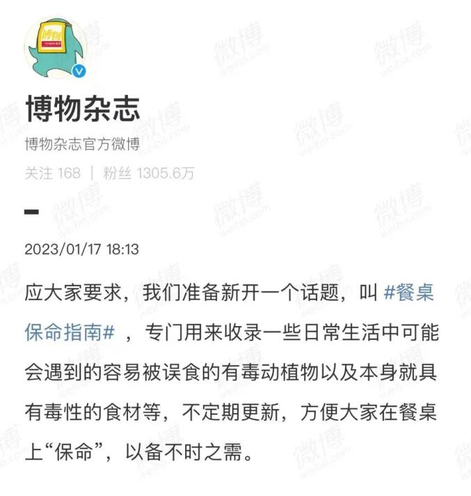 17日,博物杂志发文称,应大家要求,准备新开一个“餐桌保命指南”话题,专门用来收录一些日常生活中可能会遇到的容易被误食的有毒动植物,以及本身就具有毒性的食材等,不定期更新,方便大家在餐桌上“保命”,以备不时之需。