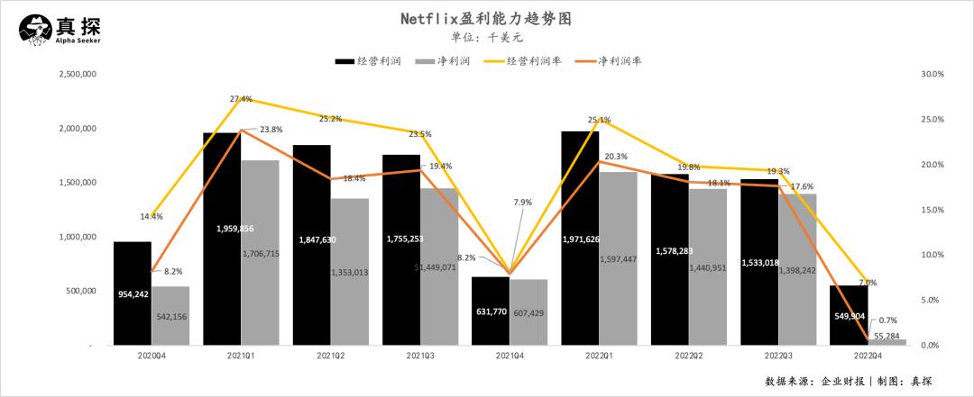 坏消息是,2022年Q4,奈飞营收为78.52亿元,同比增长1.9%,创下上市以来的增速新低;实现经营利润5.5亿美元,同比下降13%,经营利润率为7%,而去年同期为8%;实现净利润5528万美元,同比下降91%,净利润率为0.7%,去年同期为7.9%;每股收益0.12美元,低于去年第四季度的1.33美元。