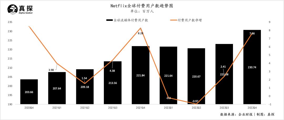 而反观爱优腾们的灯塔奈飞,经历了2022年连续两个季度用户增长“滑铁卢”,内容增长飞轮失灵,最新发布的Q4财报,也是“喜忧参半”: