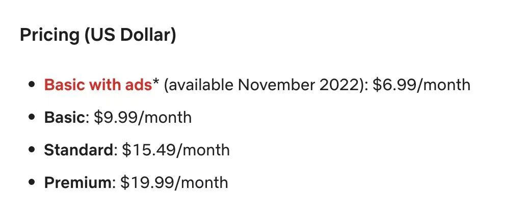 “KPI”当前,奈飞也开始探索起广告模式来增加营收。去年11月,奈飞上线Basic With Ads(广告订阅计划),该计划平均每小时会有4-5分钟的广告,但每月的付费价格仅为6.99美元/月,低于无广告版本的9.99美元/月。