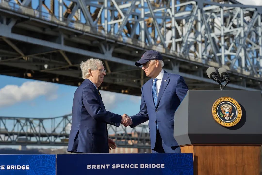 1月4日,当与参议院少数党领袖麦康奈尔一起出现在横跨俄亥俄河的布伦特-斯彭斯大桥,庆祝新的政府投资,拜登就采取了这种做法。
