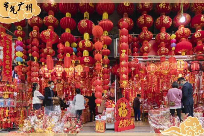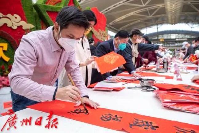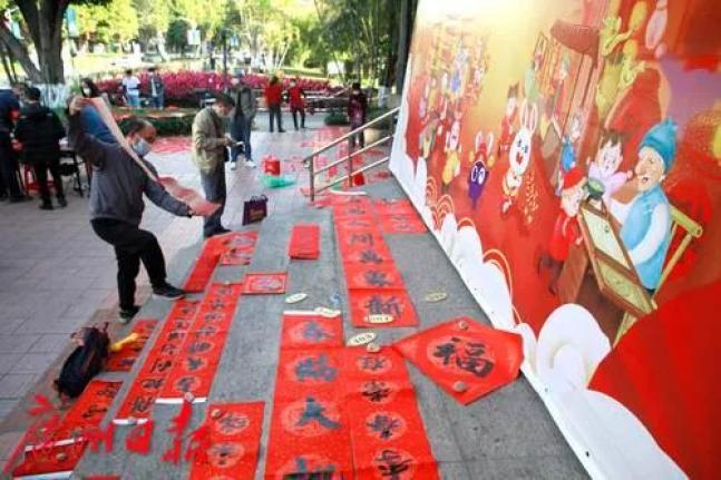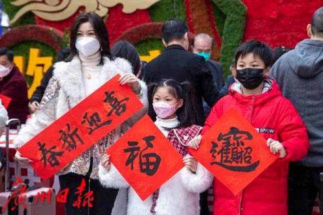 广东人称“春联”为“挥春”,挥春的款式有很多,除了寓意“福至临门”的“福”字挥春,还有各式各样祈求新年好运降临的大字挥春,“天官赐福”“新春大吉”“万事胜意”“出入平安”“恭喜发财”等,还有“一元复始,万象更新”等吉祥语。