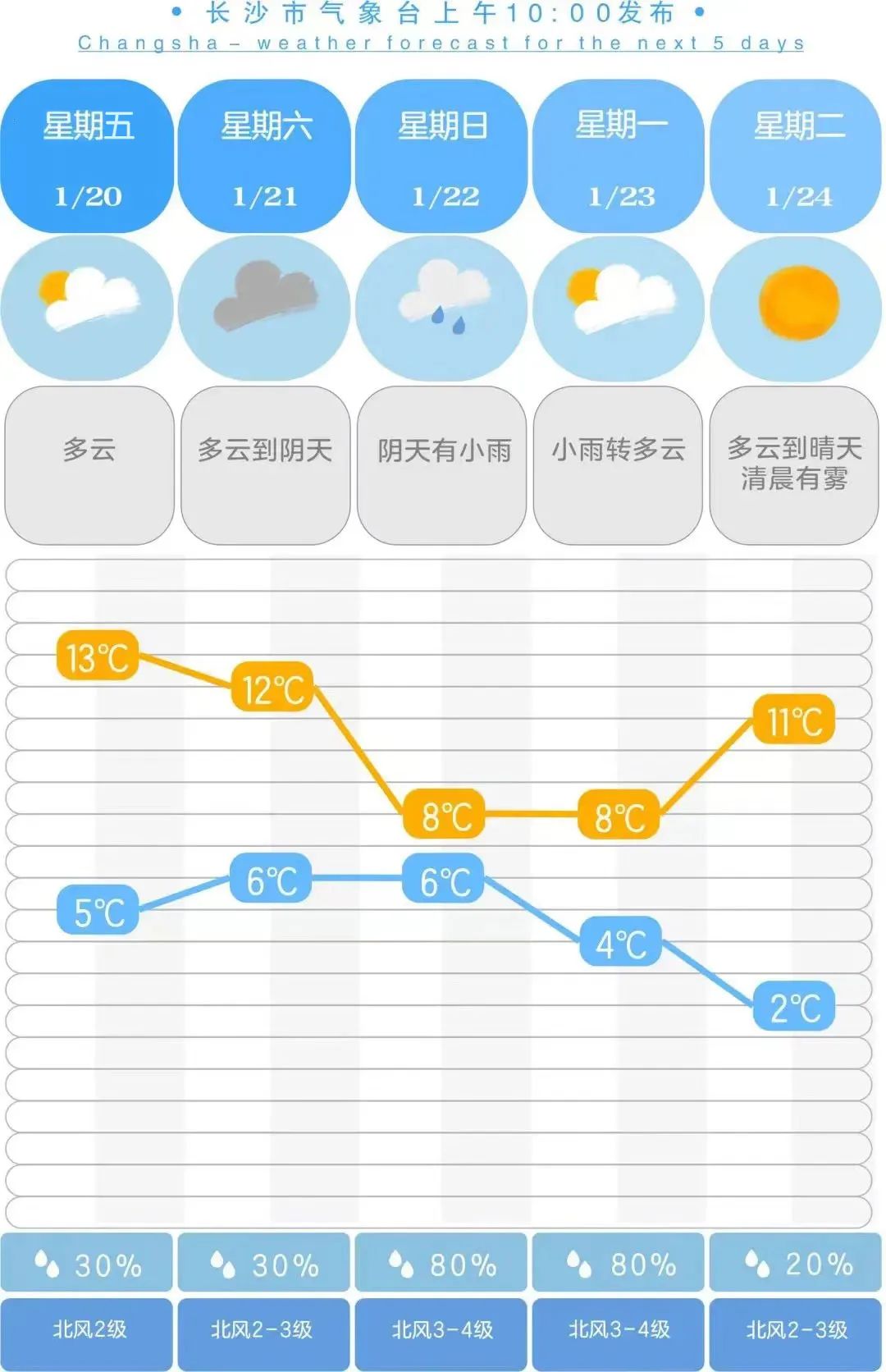 全省晴天到多云;北风2~3级;最高气温11~13℃;最低气温湘西0~2℃,其他地区2~4℃。
