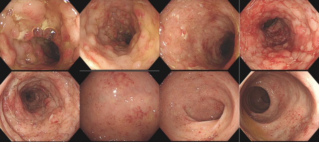 患者最终于2022月1月20日出院,嘱继续美沙拉嗪口服联合灌肠治疗,随访后视情况逐步停药;2月17日,粪钙卫蛋白 33.2ug/g,CRP 4.6mg/L;2月28日完成第三次维得利珠单抗治疗;第一次注射一周内排便逐步减少至每日1次成型黄色便。