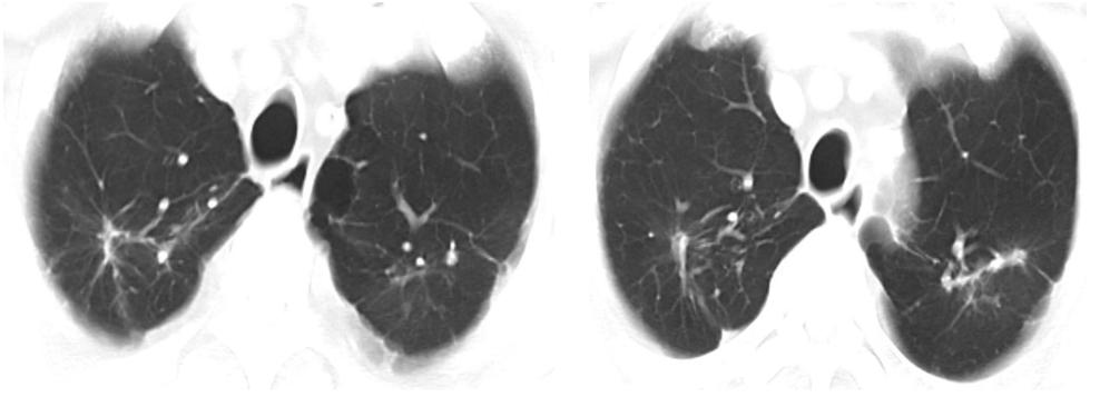 20220228 肺部低剂量CT平扫+冠状位重建:左肺下叶炎症,左肺下叶结节,建议抗炎后复查。两肺上叶纤维条索灶及钙化灶,考虑陈旧性结核可能。两肺上叶气肿伴肺大泡。胸膜局部增厚。主动脉及冠脉硬化(图5)。
