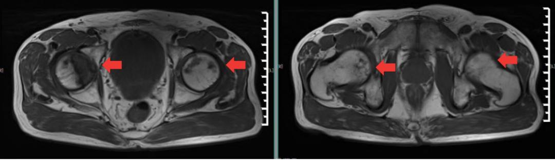 盆腔MRI:肛周、会阴软组织未见明显异常,增强未见明显异常强化。所见盆腔内未见明显积液,未见明显肿大淋巴结。附见:双侧股骨头斑片状异常信号影,呈T1WI低、T2WI高信号影,增强后强化(图3)。结论:肛周、会阴软组织未见明显异常。双侧股骨头异常信号影,怀疑股骨头坏死。