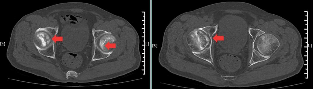 股骨头CT:右侧股骨头变形、塌陷,右侧股骨头骨质内见囊性骨吸收破坏区,部分边缘硬化,左侧股骨头局部密度增高,余双侧髋臼骨质增生,关节在位,关节间隙未见明显异常(图4)。检查结论:右股骨头坏死改变,左股骨头局部密度增高,建议进一步MRI检查。