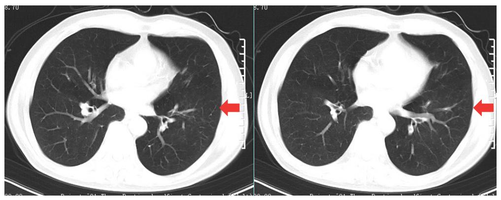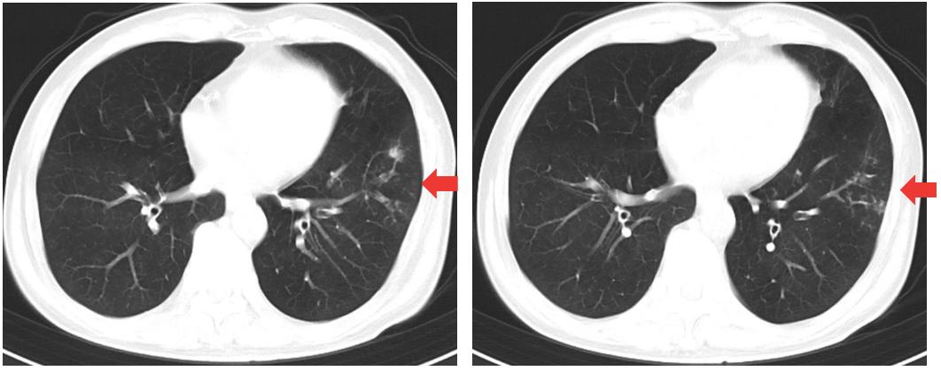 咳嗽症状显著改善。3月22日门诊复查左肺下叶炎症显著好转(图6)。
