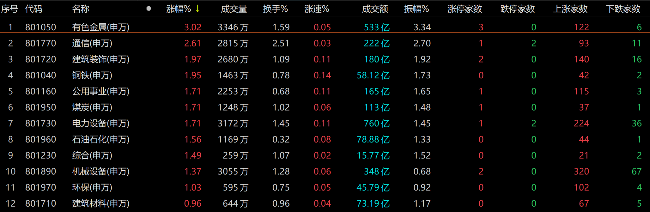 盘面上,从申万一级行业指数来看,有色金属、通信、建筑装饰、钢铁、公用事业、煤炭、电力设备等行业板块涨幅居前。