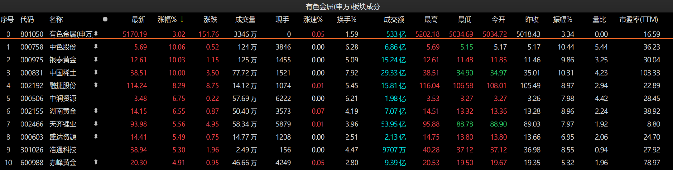 有色金属板块以整体3.02%的涨幅领涨各行业板块,板块内122只个股收涨,6只个股下跌。其中,中色股份、银泰黄金、中国稀土涨停,融捷股份大涨8.29%,中润资源、湖南黄金涨超6%,天齐锂业、盛达资源、浩通科技涨超5%。