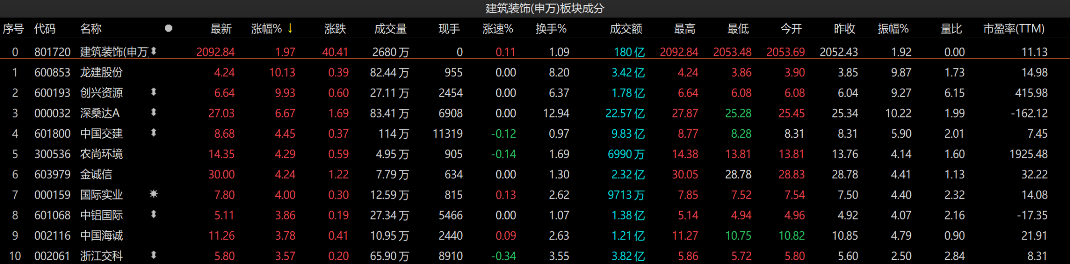 建筑装饰板块整体上涨1.97%,板块内140只个股上涨,仅11只个股收跌。其中,龙建股份、创兴资源涨停,深桑达A涨超6%,中国交建、农尚环境、金诚信涨超4%。