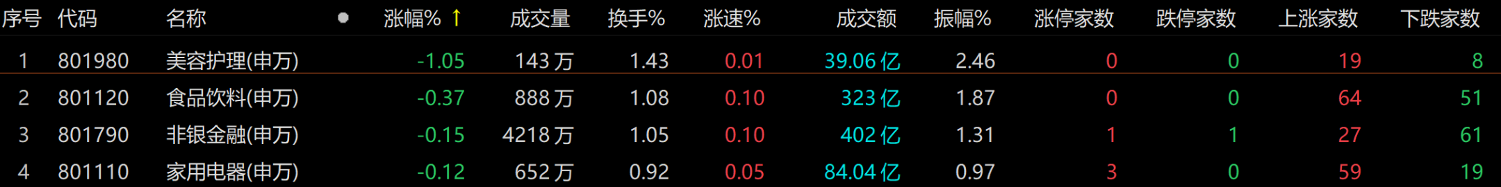 下跌方面,美容护理、食品饮料、非银金融、家用电器跌幅居前。