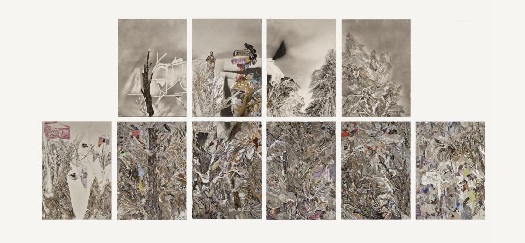 艺术家薛松的创作让我们看到一系列由拼贴构成的多元且碎片化的世界,它们形成了多维度的图像嵌套:现代化的都市风景、西方古典油画、宋元山水、老上海商业月份牌、社会主义宣传画、当代时尚广告、古典西方乐谱、书法字帖、民间刺绣、木板年画……它们既被整合在一起,同时又分裂着,每一个局部的拼贴都带着烧灼的痕迹,仿佛一切先在的秩序都将被扬弃,在灰烬和焦痕中“浴火重生” ,以一种当代的方式展现出我们时代的巨大变迁。