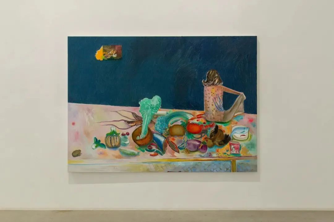 ▲ 段建宇,《餐桌(背面)》,2022始于对日常现实场景的再现,段建宇在画面叙述的过程中渐渐滑入意识的世界。在新作自画像系列《餐桌(正面)》(2021)、《餐桌(背面)》(2022)中,艺术家用极具个人形象符号的方式将自己呈现出来,《正面》中的她神情自若,与一尊尊如供品般整齐排列的瓜果造像们并肩而坐,隐隐散发着一种佛性光辉。蔬菜瓜果似乎各自为政,又具备着一种模糊的集体身份,唤起观者思考物我之间、个体和周围世界之间微妙的联结关系。
