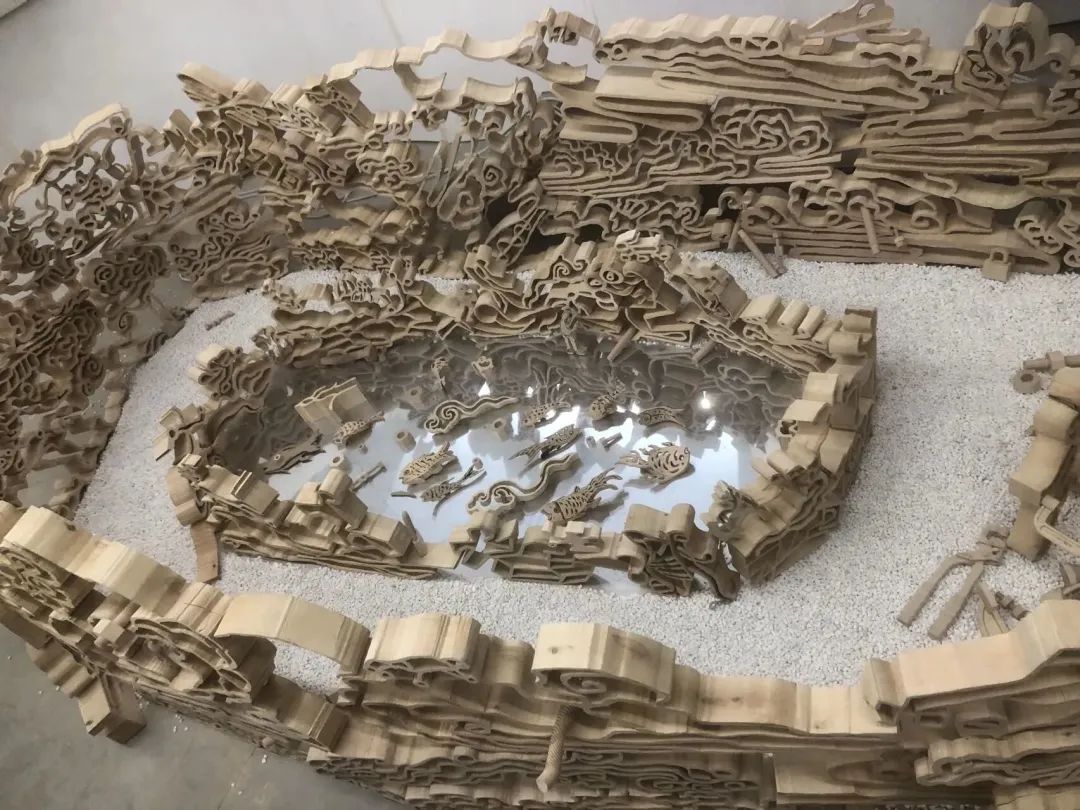 ▲ 胡项城 装置 《不断雲》 综合材料 2022(俯视)从赵孟頫的《不断云》有太多联想,我要做组作品奉献给大众。但这艰难时期我不想用太沉重方式表达,年轻时在工厂做木横工,对木头情有独钟。人们儿时观赏观赏云彩晚霞有种种想想,那时楼没那么高.也没手机,举头常能看到变幻无穷的云彩。从中仿佛可看到神仙、小鸟、野猪、鱼儿等等。