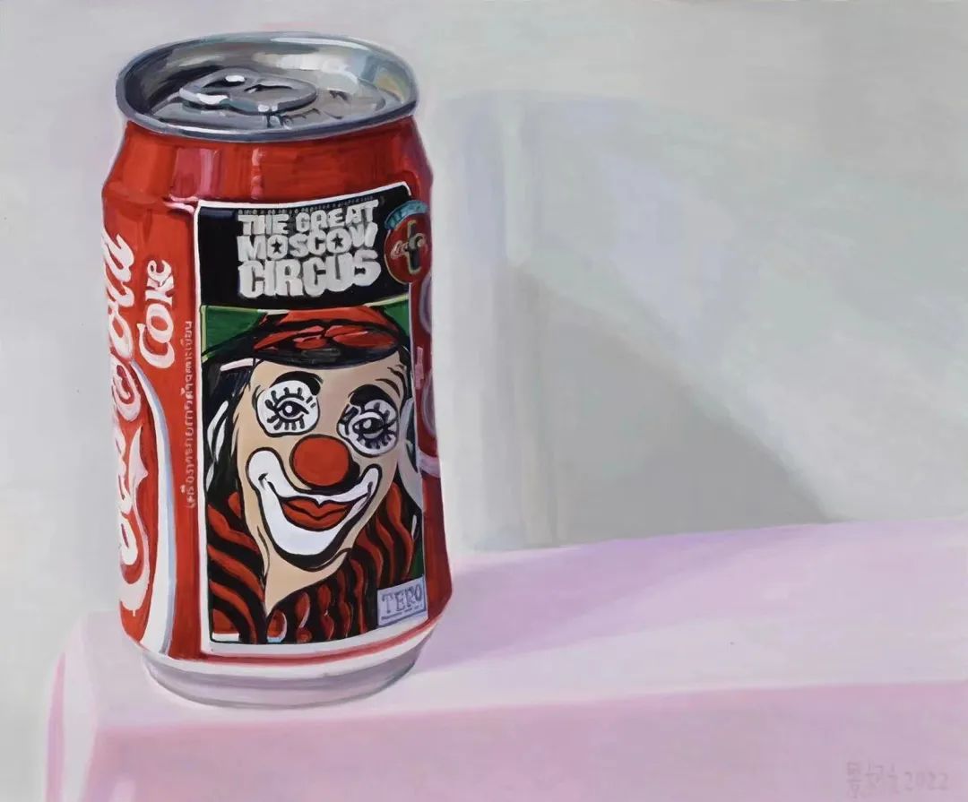 景柯文以参考黑白老照片进行创作而闻名,同时热衷于收藏有故事的物件,例如看似寻常的可乐罐和徽章。画中静物作为历史的见证,具有跨时代且跨文化的多样背景。“相信爱 2022, No.3”呈现了一个带有小丑形象的可乐罐,小丑形象代表着在任何环境下都能表现坚强的广大群众。