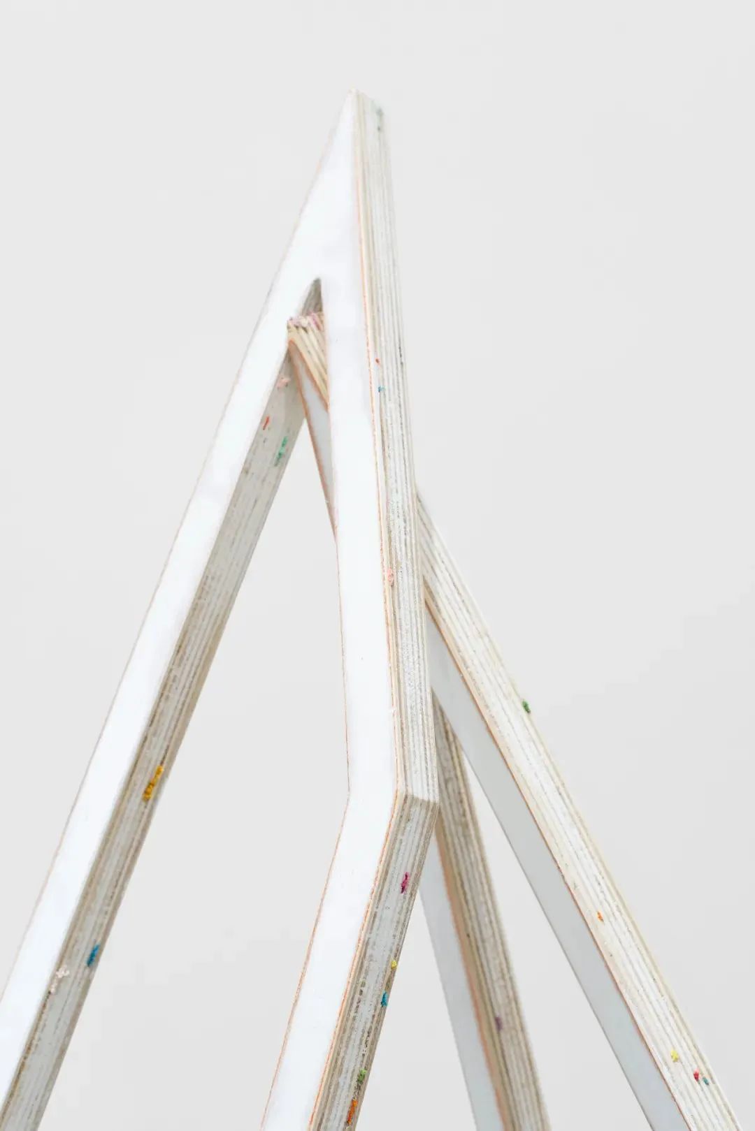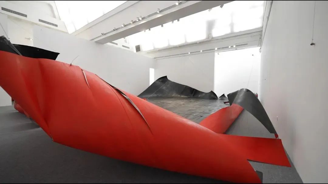 作品《何以存在》是一件场域特定的、现场制作的作品,由同类、单色的轻薄木板拼接而成,却在周身有多处撕裂,由鱼线、钢绳牵引,挤压弯曲;它时刻在呼吸颤动,生命力十足。看似跳脱,它却并非从虚无中凭空出现,而是由来有据,富有前史。