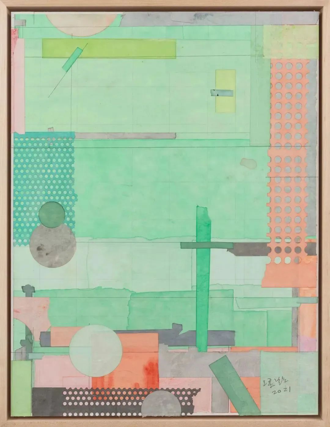 梁铨的创作源图大抵来源于随处可见的生活场景,自己对某一时刻的回忆,以及现实世界的投射和提炼,作品语言上大概有三个方向:1-喝茶时留下的茶渍入画;2-从现实中提炼出来的几何造型拼贴;3-以上两者相结合的综合媒介。反复和拼贴,是梁铨用具体的“真实性”去无限接近“空”的一种表达,正如他自己对这种“空”的描述:我在如地毯般的草坪中,选了一株草,我盯着它看了半分钟,然后将视线移开,仅仅一会,我已经无法从这一片绿色中再次将它辨认出来——世界是细致而真实的,看起来所有事物都微不足道。