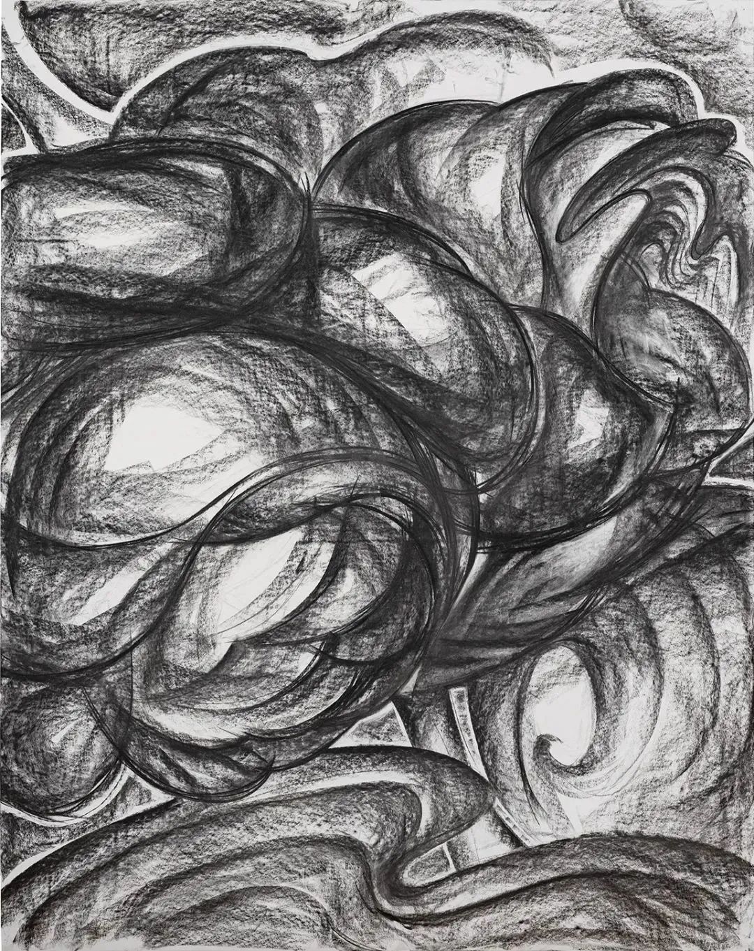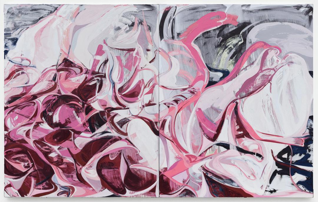 《角斗场》系列绘画延续并深化了艺术家早先对于身体作为心理、情感、精神状况投射的讨论,更如其标题所提示的那样,将身体作为与他者或自身于外在或内在对抗性的场域。作品中的身体愈发抽象,甚至曾经以骨架作为结构的方式也不再显见,取而代之的是以流淌的曲线塑造而成的肉体“团块”。“团块”作为画面中的基本单元与结构,其边缘色彩差异带来分明的界限,多变且时常相互抵牾的线条走势带来对抗与分裂,而自然流淌或相互遮蔽的颜料或缠斗或融合。由此,原本静止的画面也获得了强烈的动态,将艺术家创作时的身心状态展露无遗。
