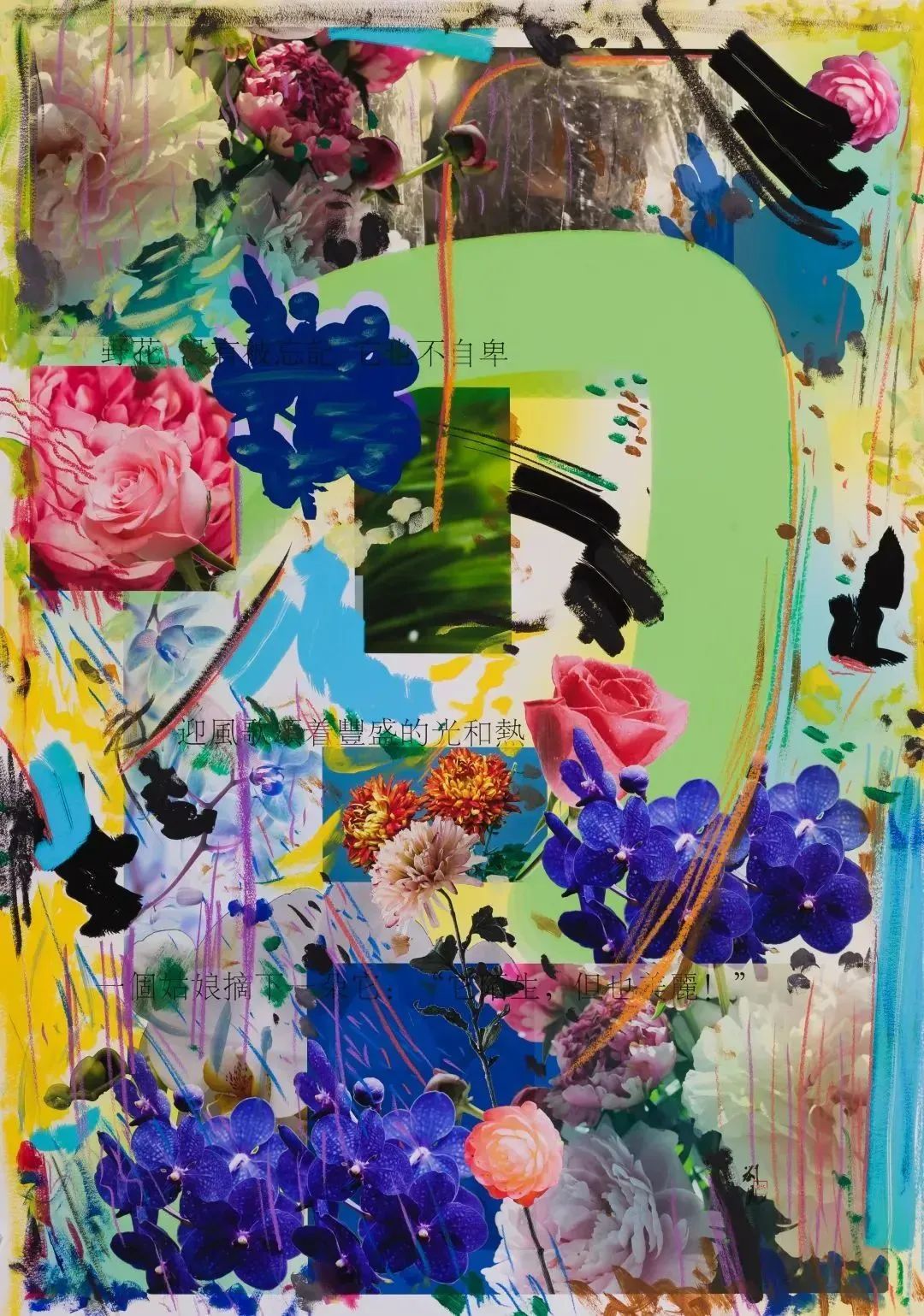 本科与硕士毕业于中央美术学院版画系的许宏翔将版画思维融入自身的绘画创作中。他有意选择那些常见的被“美化”的图像,特别是免费图片库里提供的图像,艺术家将其打乱,按照特定的结构和要素去搭配,再用无厘头的乱笔、心血来潮的荧光恶墨和刮洗过后的浮泛浅白,来组成一幅幅犯着各种绘画上的“错误”和充满着不和谐因素的作品。