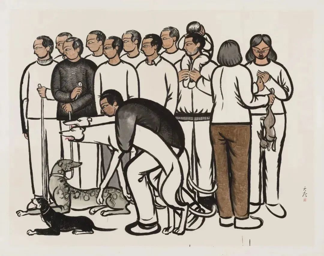 在“斗狗”和“火葬”题材绘画中,在残酷和血腥的现实面前,人物也都保持着统一化的无表情状态。麻木的表象之下,是一种众生行走,皆如魂魄的精神虚无。巨大的画面之下,作为观者的我们体悟到的是肉身之美,势必逃不过领悟死亡的宿命感。