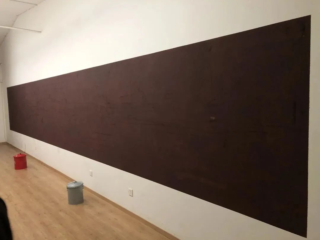 《221122》尺寸的高度是空间一侧的窗口高度,长度由另一侧的落地窗离墙角的距离决定。一个细长方形,形如老火柴盒侧面的擦皮形状,为观众提供了充分的创作空间。这件作品也成为迄今为止在蔡锦空间展出的最大的作品。开幕当天,无数到访者在画面上划下火柴。最终这面墙形成了一幅看似赛·托姆布雷(Cy Twombly)的抽象作品。