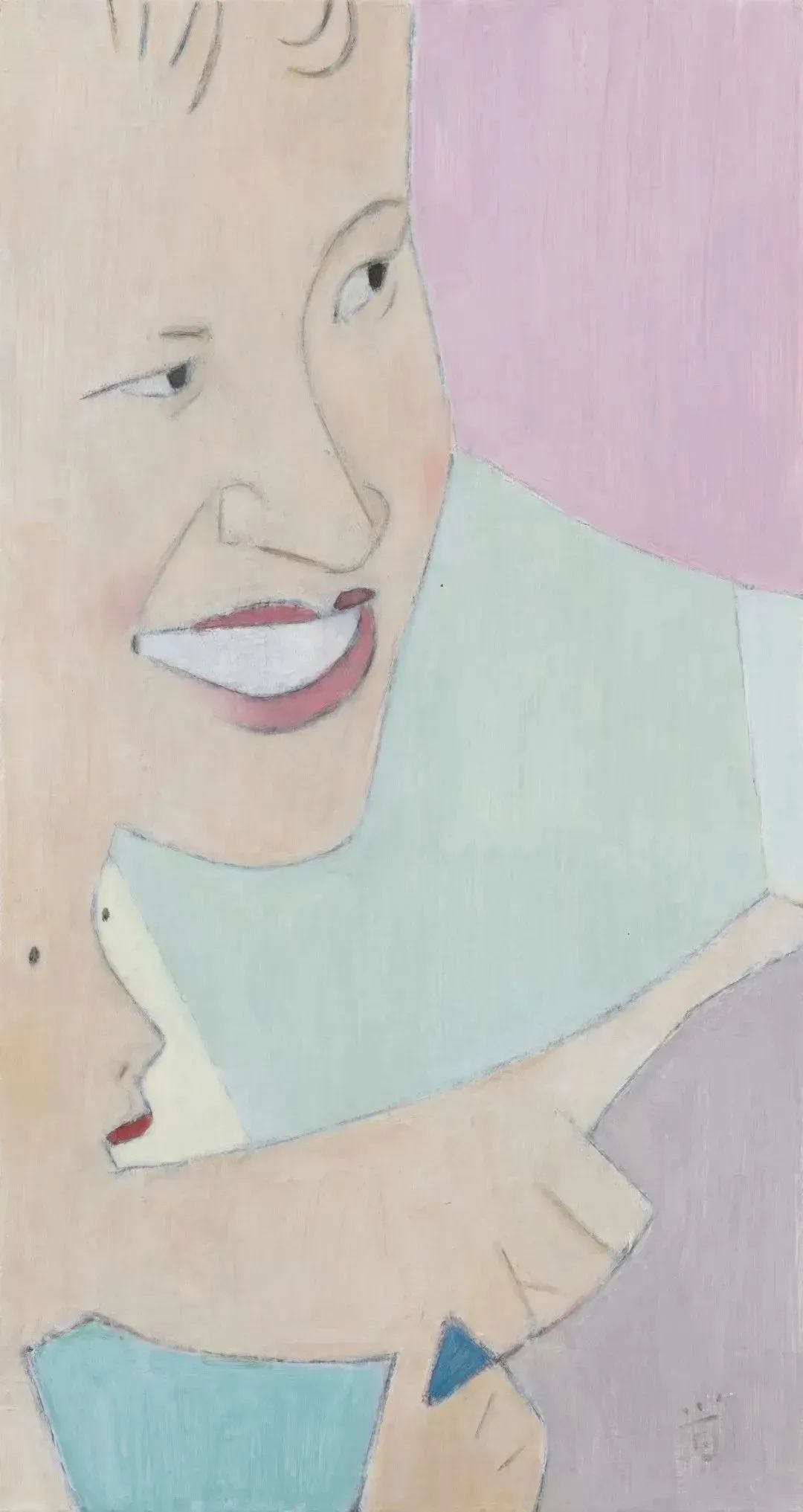 王音的工作常常始于其收集的老杂志上的照片,这些图像承载了艺术家的记忆与情感,肖像照中人们简单的动作成为艺术家开始工作的起点。最终这些人物完全脱离开原来的语境,画面淡雅的色彩犹如微微褪色的彩色照片,透露着岁月的气息,而造型让观众在陌生感中探寻新的趣味。